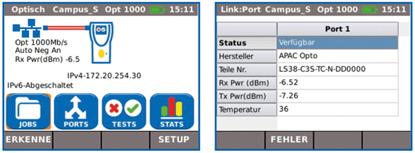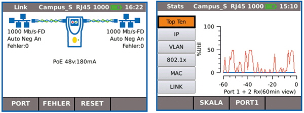 • Ethernet-Durchgangsprüfung am Gerät bis 10/100/1000 Mbit/s.