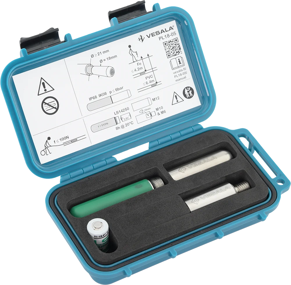 Die Vesala Sonde PL18-05 ist das Spezialwerkzeug für metallische Rohrleitungen. Während die 33 kHz Vesala Sonden für Kunststoffrohre und nicht-leitende Strukturen optimiert sind, arbeitet die PL18-05 mit 512 Hz – einer niedrigen Frequenz, die sich in metallischen und leitenden Rohrmaterialien deutlich besser ausbreitet.