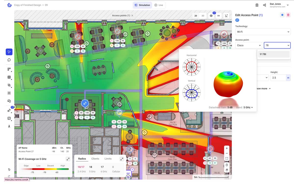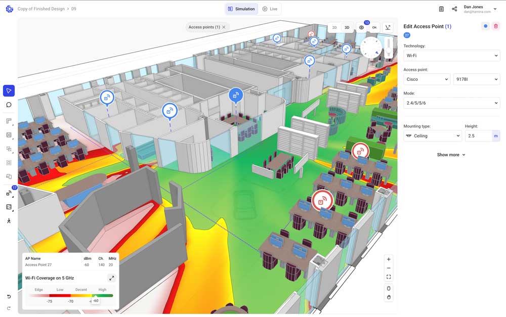 Die Echtzeit-Heatmaps zeigen dir sofort die Auswirkungen jeder Änderung. Du siehst Signalstärke, Signal-Rausch-Verhältnis, Datenraten und Kanalüberlappungen – alles live, während du planst. Die 3D-Ansicht hilft bei komplexen Gebäuden mit mehreren Etagen.